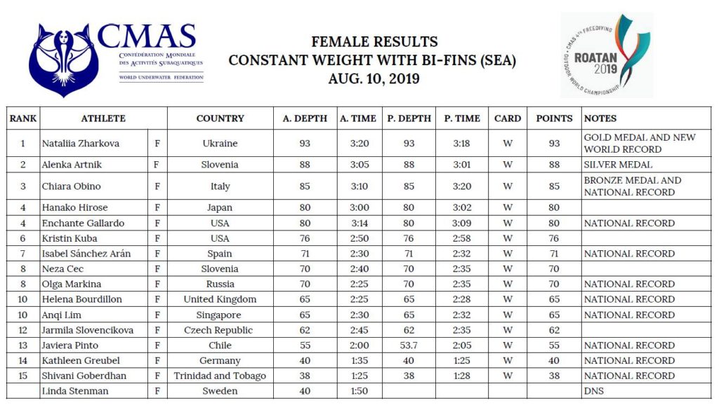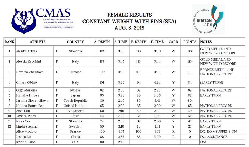 image Classifica Mondiale Femminile di Apnea in Assetto Costante con Pinne 2019