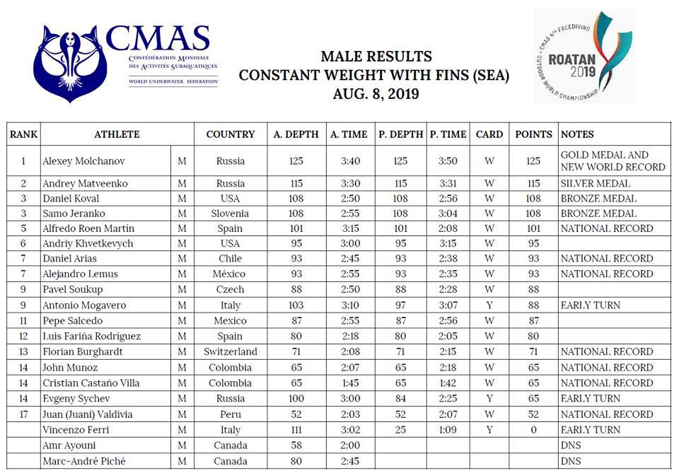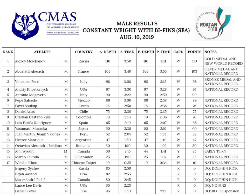 image Classifica Mondiale Maschile di Apnea in Assetto Costante con Pinne 2019