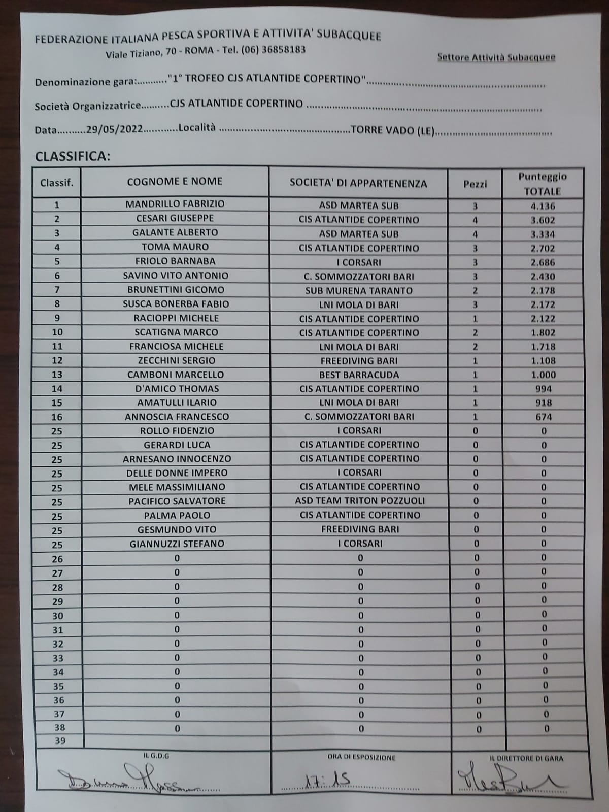 Classifica Trofeo CJS Atlantide Copertino