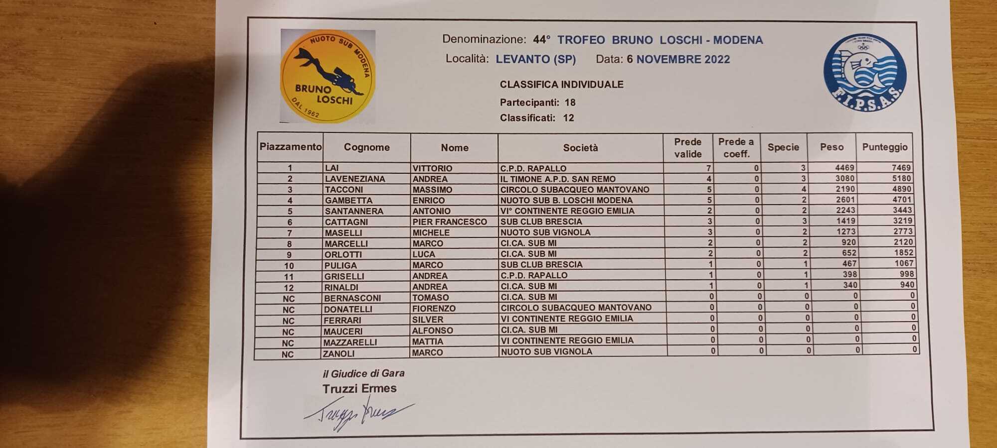 Classifica 44° Trofeo Bruno Loschi