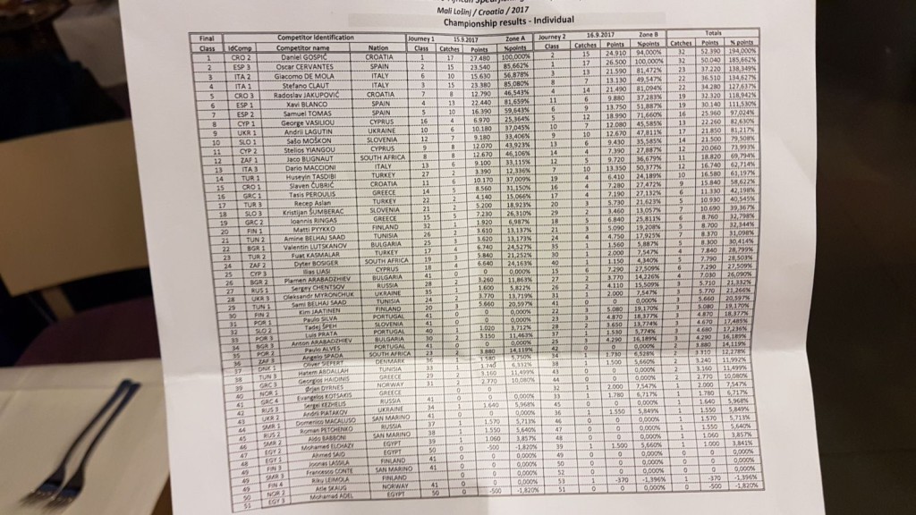La vittoria della prima giornata unitamente al secondo posto ottenuto nella seconda, dove ha portato al peso un carniere composto da quindici prede (cinque gronghi, sei mostelle, un sarago e tre corvine), gli hanno consentito di salire sul gradino più alto del podio, davanti allo spagnolo Oscar Cervantes, il quale, nonostante la vittoria della seconda giornata con diciassette prede (tre gronghi, due capponi, due corvine e dieci mostelle), si è dovuto accontentate (si fa per dire) della medaglia d’argento finale. Ha completato il podio Giacomo De Mola, che, con il sesto posto della prima giornata e il terzo posto della seconda, conseguito grazie a un carniere di tredici prede (dieci mostelle, due gronghi e un pesce san pietro), si è reso protagonista di una meritatissima medaglia di bronzo.