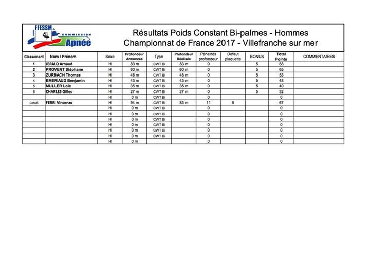 Molto buona anche la prova di Vincenzo Ferri nella competizione di apnea in assetto costante con pinne, dove, con la profondità di 67 m., è riuscito a conquistare il secondo posto, alle spalle di Arnaud Jerald, oro con 83 m. Ha completato il podio Stéphane Provent, terzo con 60 m.