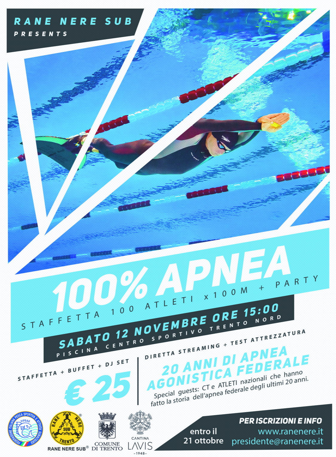 Era il giugno del 2002 quando il Club Rane Nere Sub Trento ASD organizzava a Trento la prima gara selettiva di apnea della storia della Federazione Italiana Pesca Sportiva e Attività Subacquee (FIPSAS), dando così il via all’agonismo federale per la disciplina. Da allora la pratica agonistica dell’apnea ha visto una crescita costante, con risultati brillanti che hanno portato il nome della Federazione ai vertici mondiali. Vogliamo festeggiare questa ricorrenza, in riconoscimento a tutti coloro che hanno contribuito a far crescere l’apnea nel seno della Federazione, con un evento “100% apnea”: una staffetta dove 100 atleti percorreranno 100 metri. La manifestazione si svolgerà nella stessa piscina dove ha avuto luogo la prima gara nel 2002, come allora sarà organizzata dalla nostra ASD e vedrà la partecipazione di alcuni degli atleti che 20 anni fa si sono messi in competizione. Unico come tipo di evento (non abbiamo infatti notizia di un’altra manifestazione dove 100 atleti - di entrambi i sessi e le categorie - si sono passati il testimone percorrendo ciascuno 100 metri) vuole essere anche il simbolo di come l’apnea federale ha trovato ampia accoglienza e pratica. Invitati speciali saranno gli attuali atleti della Nazionale Italiana, i Commissari Tecnici e tutte le figure che hanno fatto in Italia la storia della disciplina.