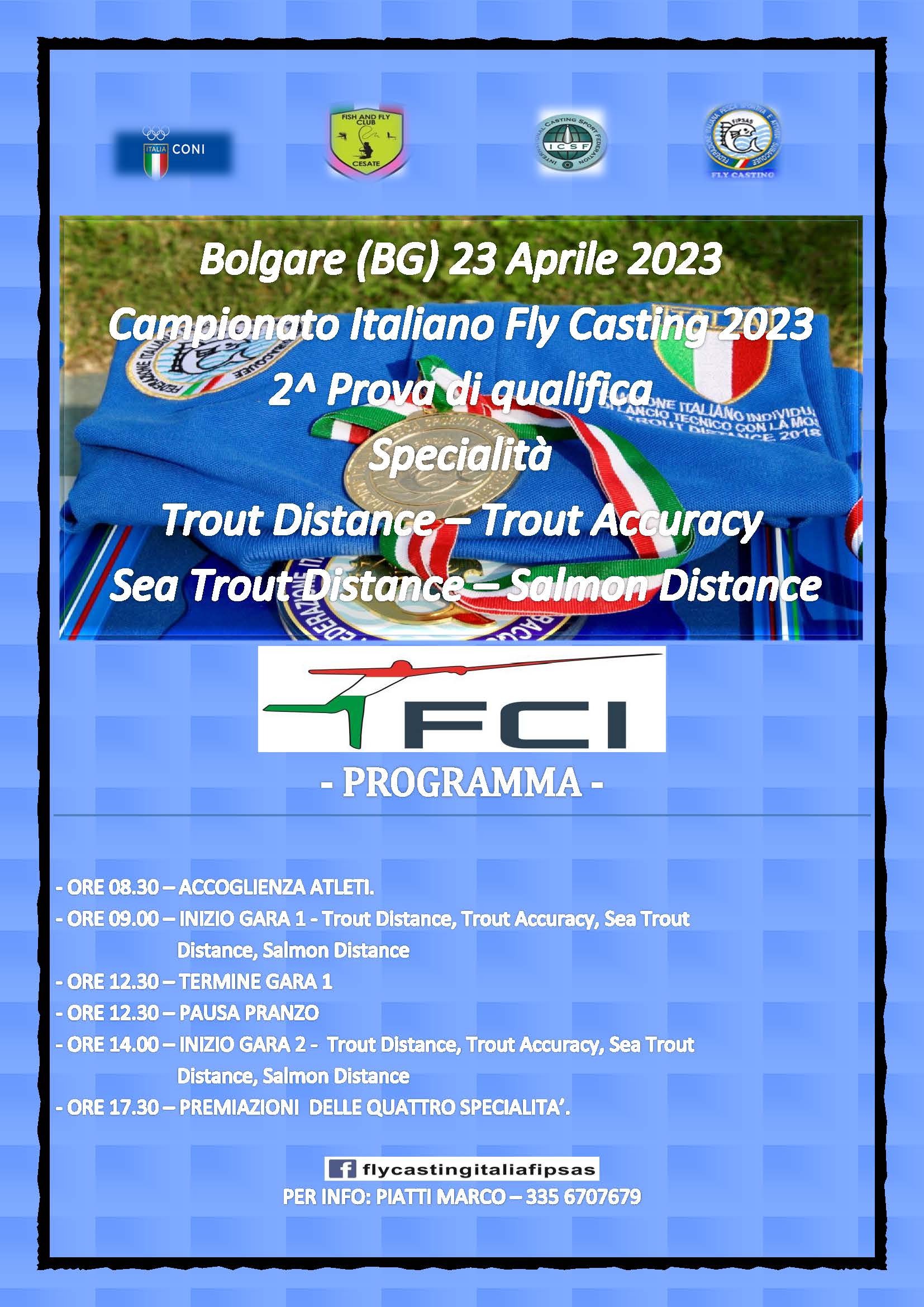 In riferimento alla 2° prova del Campionato Italiano di Fly Casting che si svolgerà il 23 aprile p.v. a Bolgare (BG) si comunicano le seguenti informazioni: